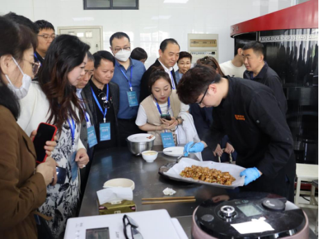 首先孟祥忍主任带领考察团参观了中餐繁荣基地,观摩烹饪机器人菜肴制作。