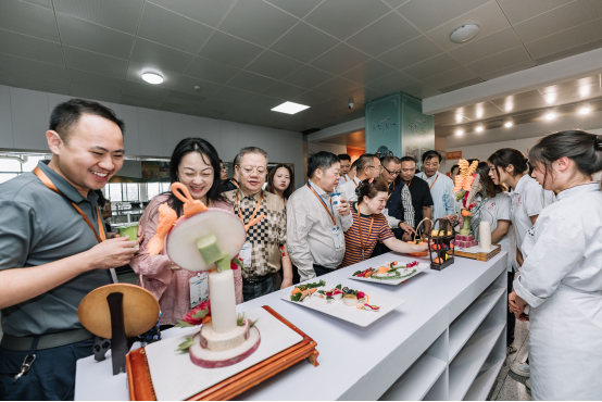 来自美国、澳大利亚、法国等海内外侨商侨领代表共60余人参加活动。侨商侨领代表一行听取了基地详细介绍,了解基地概况,观摩烹饪机器人菜肴制作和中餐传统烹饪技艺表演,沉浸式体验经典淮扬菜技艺现场展示。本次活动还为嘉宾精心准备了中餐繁荣教材和视频教学资料。一道道淮扬美食、家乡“锅气”,唤起海内外侨胞共同的记忆情感。