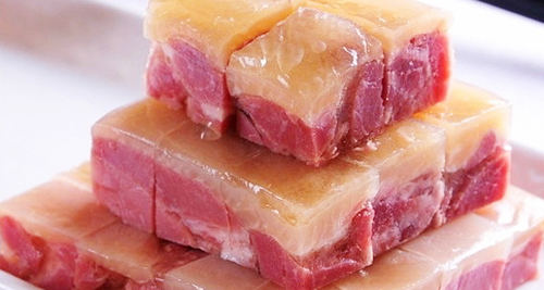 水晶肴肉又名水晶肴蹄,是江苏镇江区汉族传统名菜,属于苏菜系,迄今已有300多年的历史。水晶肴蹄成菜后肉红皮白,光滑晶莹,卤冻透明,犹如水晶,故有“水晶”之美称。食用时,具有瘦肉香酥、肥肉不腻、酥香嫩鲜等特点,佐以姜丝和镇江香醋,更是别有一番风味。有诗赞曰:“风光无限数今朝,更爱京口肉食烧,不腻微酥香味溢,嫣红嫩冻水晶肴。”[详细]