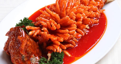 “松鼠鳜鱼”是江苏苏州地区的汉族传统名菜,属苏菜系。在江南各地一直将其列作宴席上的上品佳肴。用鳜鱼制菜各地早有,一般以清蒸或红烧为主,而制做形似松鼠的鳜鱼菜肴则首先是苏州地区。相传清代乾隆皇帝下江南时,曾微服至苏州松鹤楼菜馆用膳,厨师用鲤鱼出骨,在鱼肉上刻花纹,加调味稍腌后,拖上蛋黄糊,入热油锅嫩炸成熟后,浇上熬热的糖醋卤汁,形状似鼠,外脆里嫩,酸甜可口。清代《调鼎集》记载:“松鼠鱼,取(鱼季)鱼肚皮,去骨,拖蛋黄,炸黄,炸成松鼠式,油、酱烧”。此菜从创制至今已有二百多年的历史。[详细]