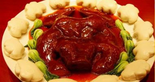 扒烧整猪头是江苏地区汉族传统名菜,属于淮扬菜系,是将新鲜的猪头去除骨头、毛,从中间切开后洗净,放入锅中加入酱油、盐、冰糖等调品料煮烂即可食用。本菜肉质烂熟,肥而不腻,香气扑鼻,甜中带咸。是一道老少皆宜的美食。[详细]